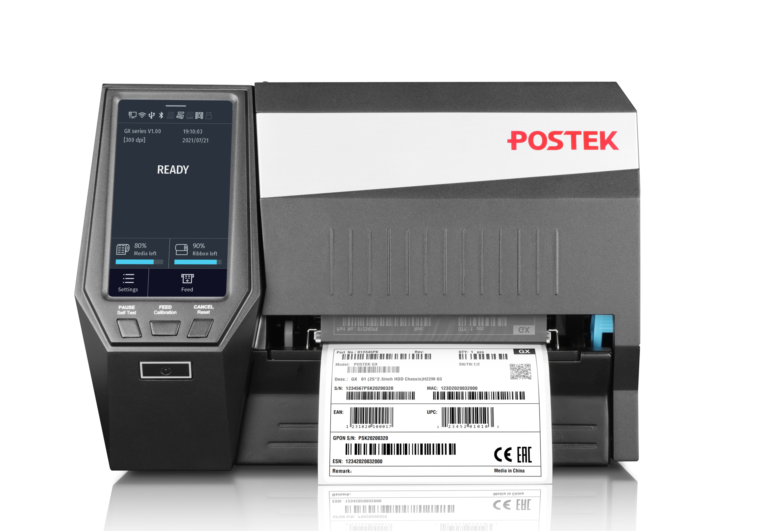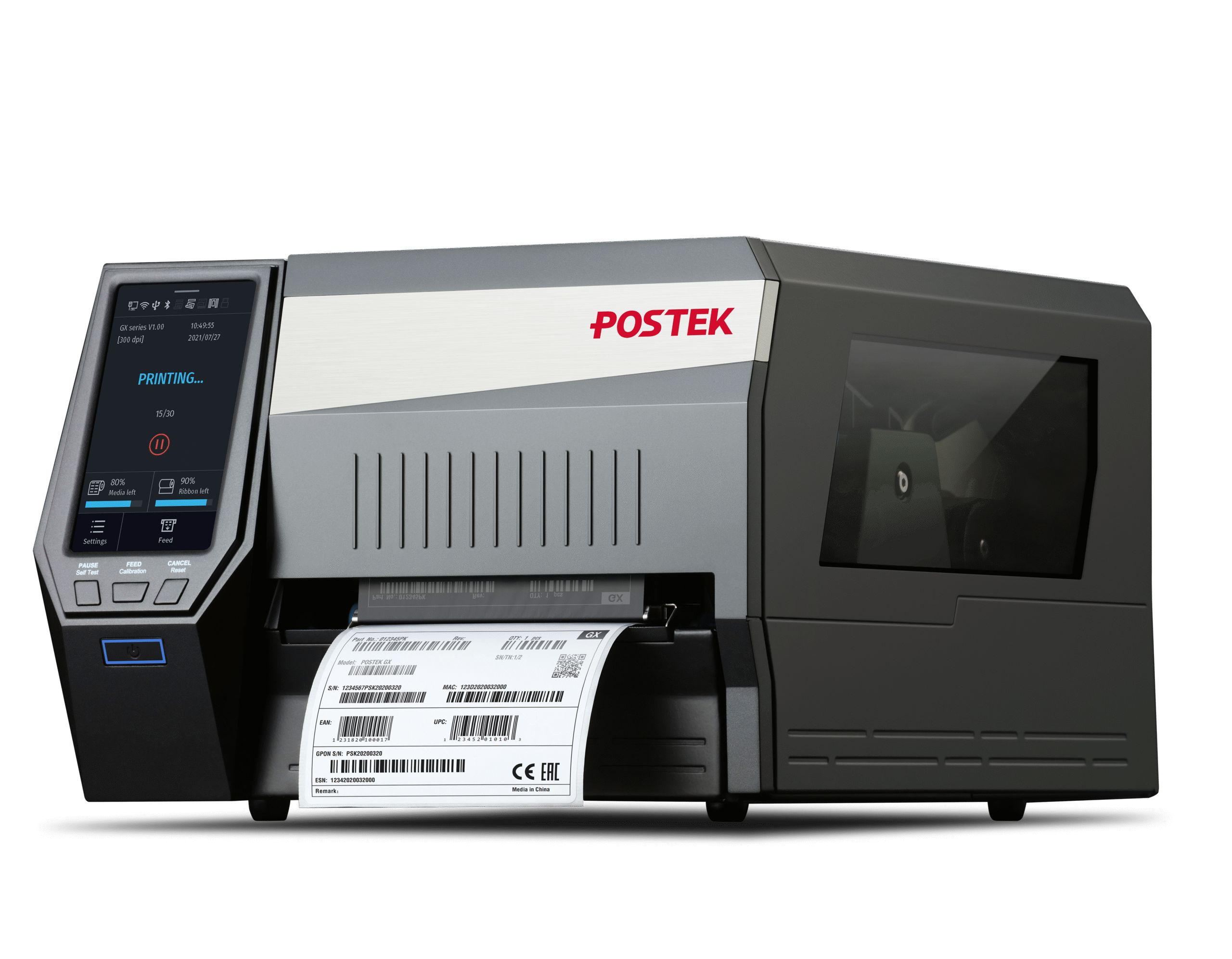 GX POSTEK Impresora Industrial RFID UHF Resolución de 300 dpi Velocidad de impresión de hasta 10″ por segundo Ethernet, USB host, USB client, WiFi, Bluetooth Pantalla interactiva de 5,5″